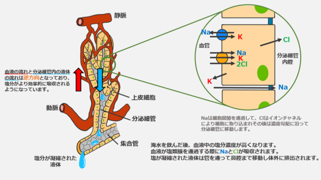 塩類腺の構造は腎臓のように対向流の血液が流れており、これにより塩を効率よく血液中から取り除くことができます。